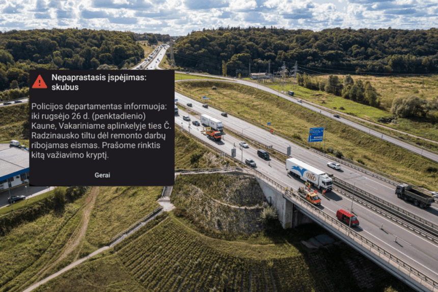 „Policijos departamentas informuoja: iki rugsėjo 26 d. (penktadienio) Kaune, Vakariniame aplinkkelyje, ties Č. Radzinausko tiltu, dėl remonto darbų ribojamas eismas. Prašome rinktis kitą važiavimo kryptį“.