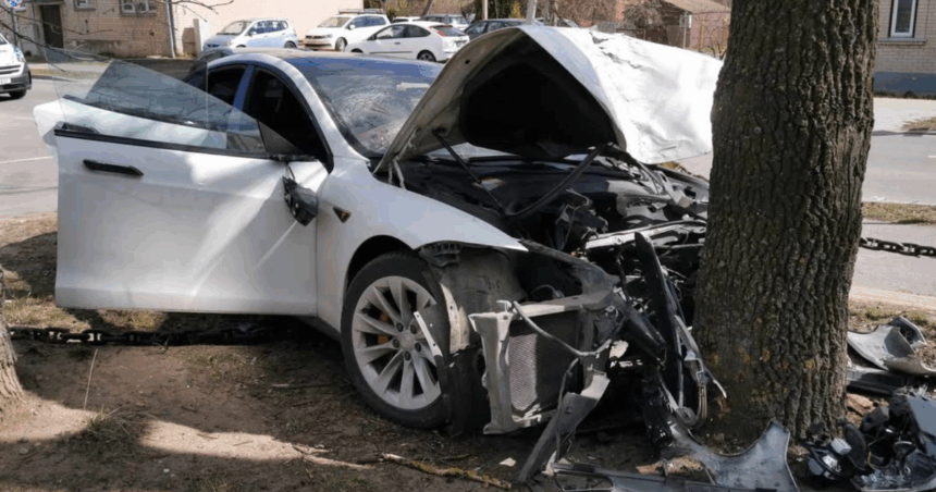 Kauniečių pasidalintoje vaizdo medžiagoje matomas į medį įsirėžęs „Tesla“ markės automobilis, suknežinta priekine dalimi.